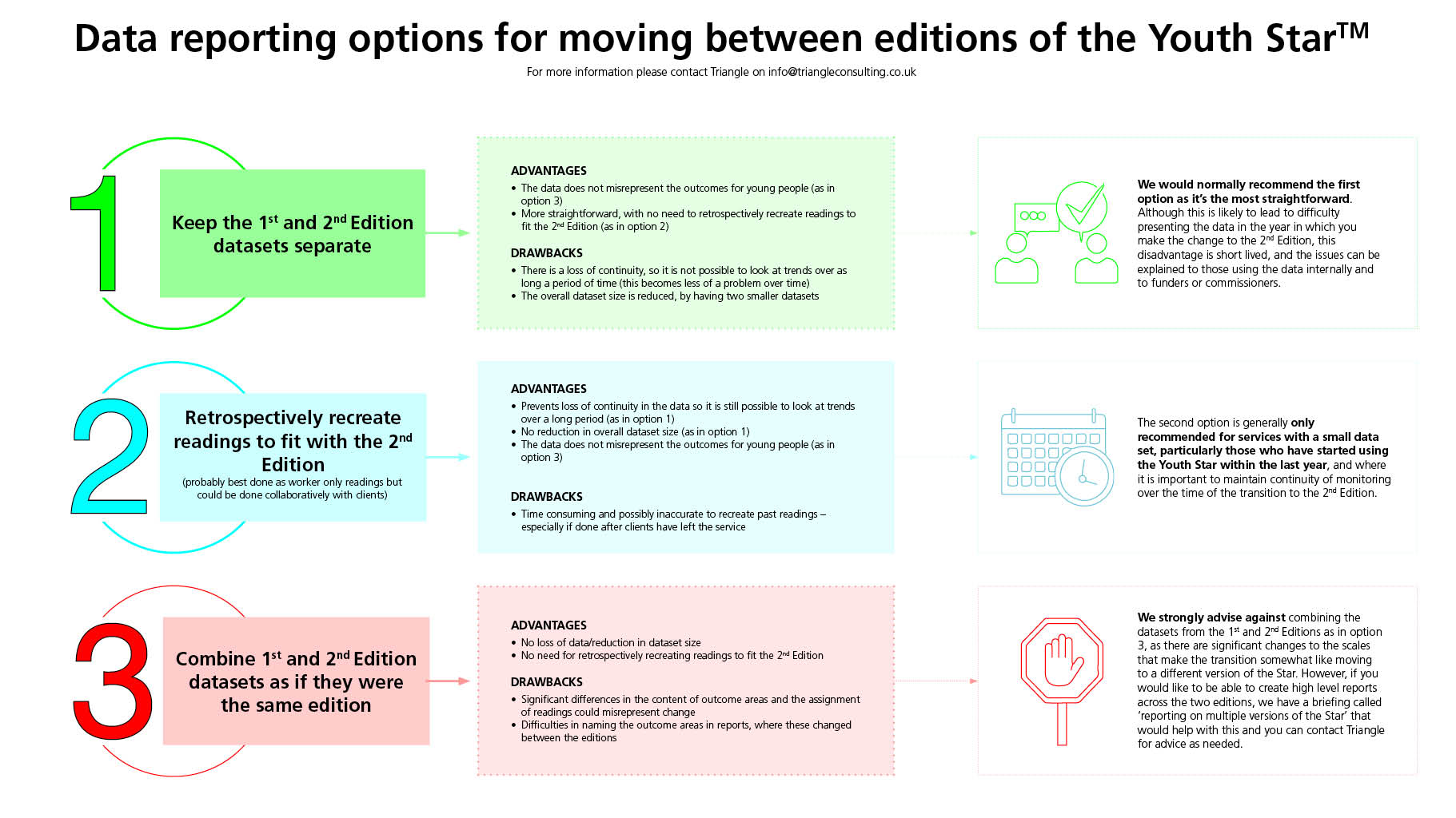 In 2021, Triangle concluded a review of the Youth Star which included feedback from current users, revisions and a pilot with a range of organisations. Triangle worked with a range of services and service users to tweak the Star and changed language to be more accessible, sensitive, trauma-informed and responsive and to develop additional resources and Scales to open up and have difficult conversations around a range of areas which can impact their service users, and which can affect their relationships and effectiveness of their support.